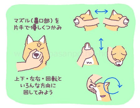 犬の背後に回り、右手でマズルを掴み左手を首の下にあて、上下左右ぐるっと回転させる動きを1日に何度も行いました。